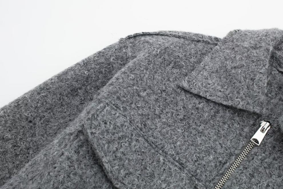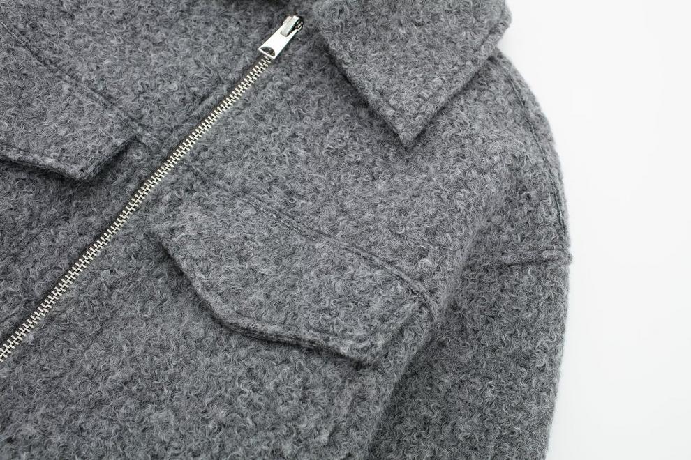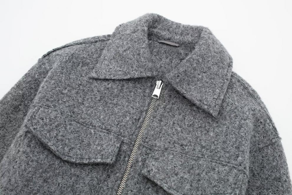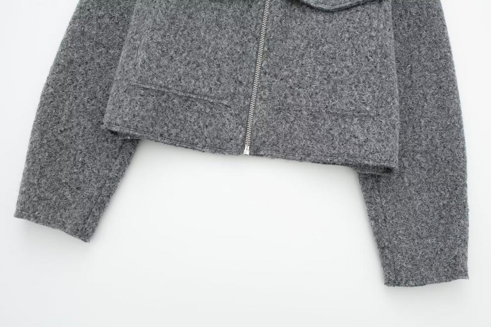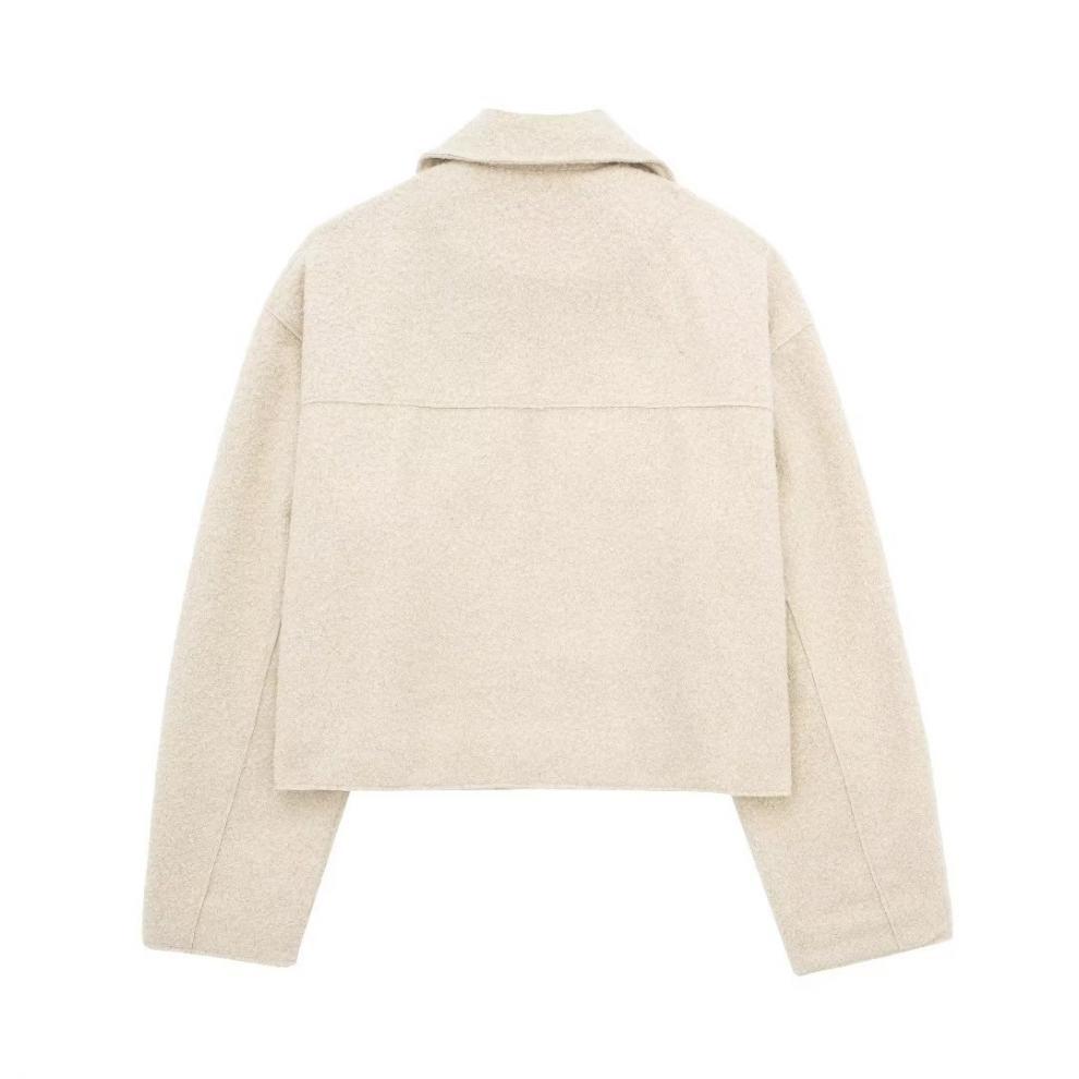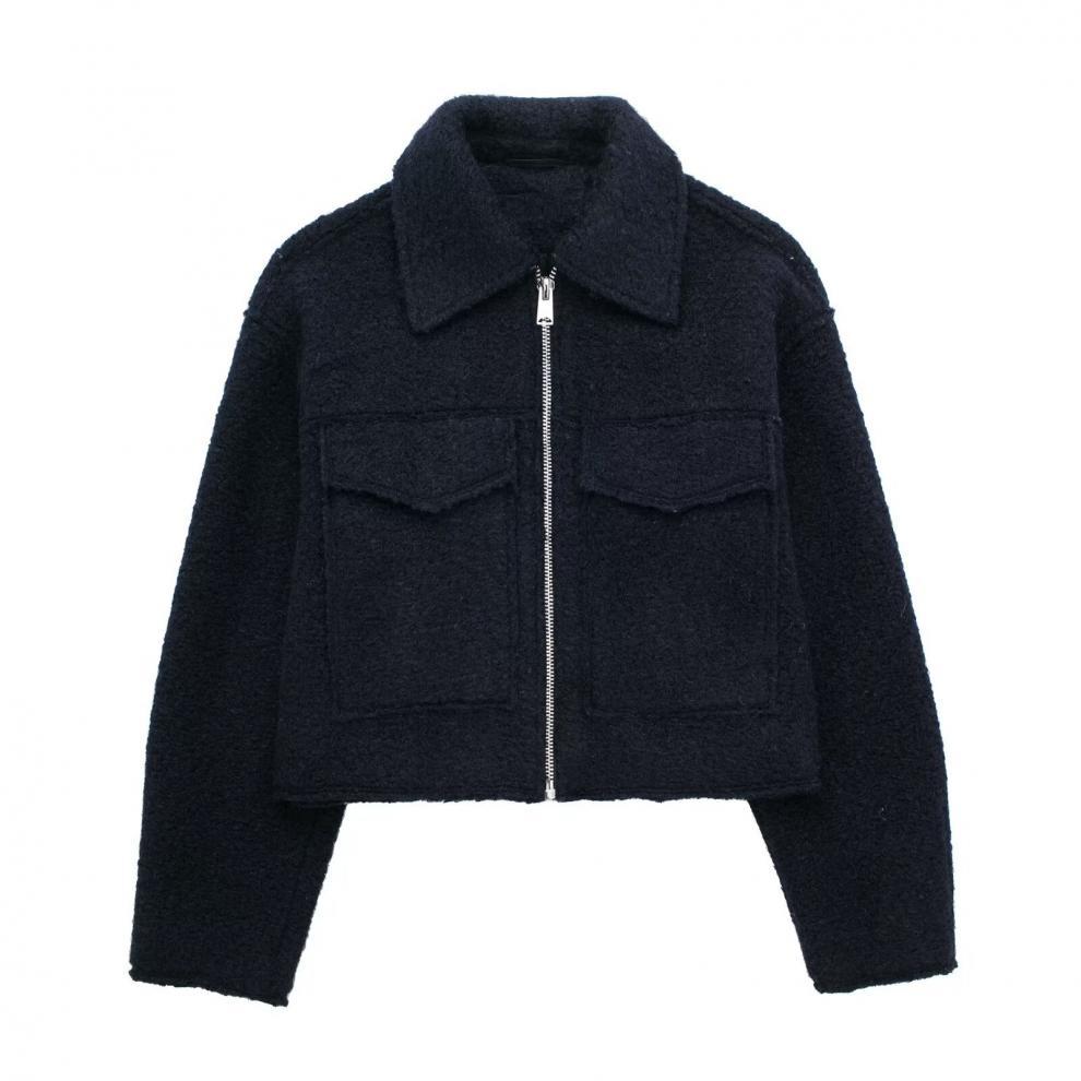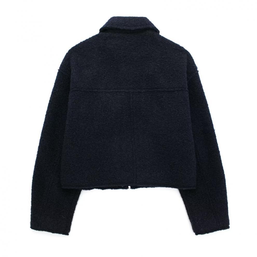 Fashionable Design: Trendy street-style short jacket with polo collar and patchwork detailing for a contemporary look.